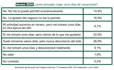 Aunque la Federación no realizó una encuesta exhaustiva el año pasado sobre este aspecto, sí preguntaron a los autónomos en el Barómetro del segundo trimestre de 2024 si tenían pensado tomar unos días de vacaciones, con los siguientes resultados: